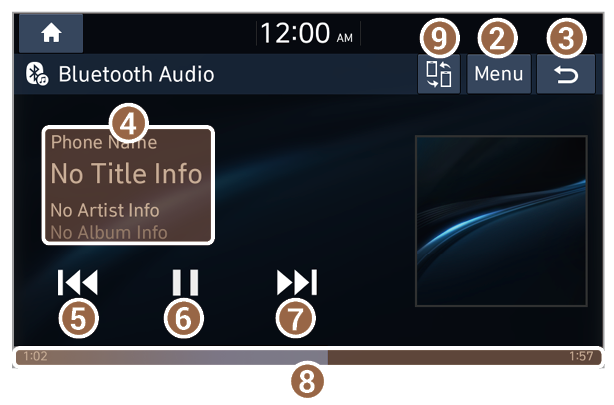 - Information about the song currently playing. Press a song′s artist or album information to access a list of songs by the artist or from the album playing.
