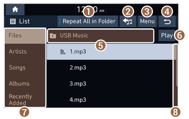 - On the control panel, turn the Search knob (TUNE FILE) to find the desired song and press the knob within five seconds to play the file. If no control is detected within five seconds, the search is canceled and the screen displays information about the song currently playing.