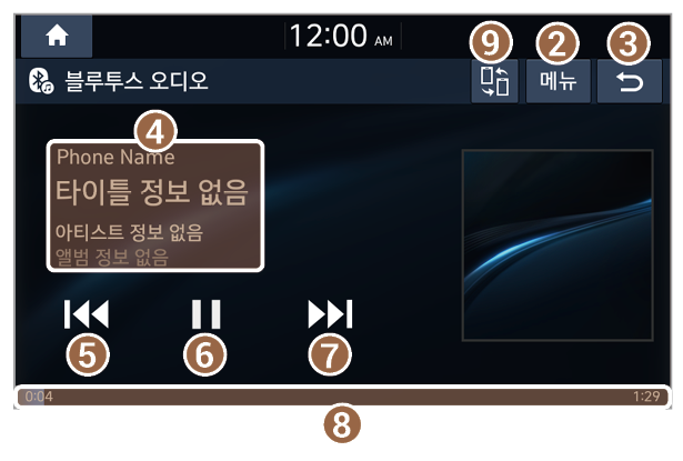 - 재생 중인 곡 정보. 아티스트나 앨범 정보를 누르면 현재 재생 중인 곡이 있는 아티스트 또는 앨범 목록으로 이동합니다.