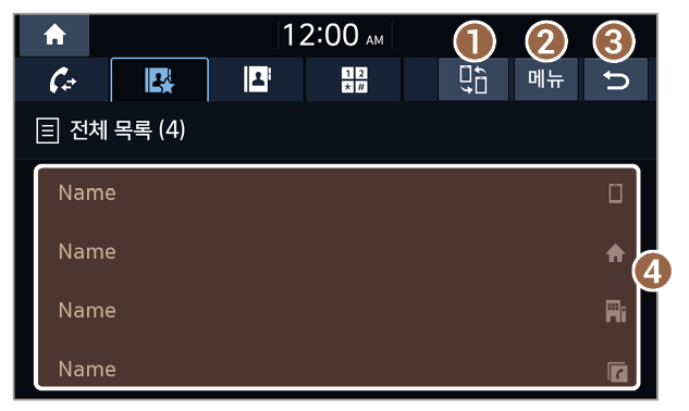 1. 화면을 누르지 않고 스티어링 휠의 탐색 레버/버튼을 사용해 원하는 연락처로 이동할 수도 있습니다.