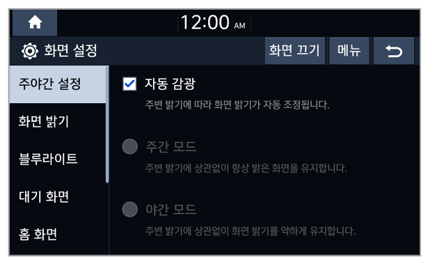 주변 환경의 밝기 또는 전조등의 상태에 따라 시스템 화면의 밝기가 자동으로 주간 모드 또는 야간 모드로 변경되도록 설정할 수 있습니다. 각 모드의 화면 밝기를 조절하려면