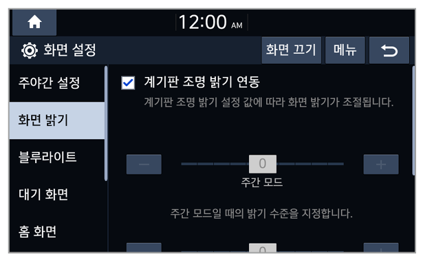 계기판의 조명 밝기에 따라 시스템 화면의 밝기가 자동으로 조절되도록 설정할 수 있습니다. 이 기능을 끄면 선택한 화면 밝기 모드에 따라 주간 또는 야간 모드의 밝기를 조절할 수 있습니다.