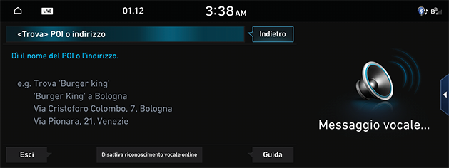 - Pronunciare "Cerca indirizzo" o "Trova POI". Viene visualizzata la schermata di ricerca locale vocale.