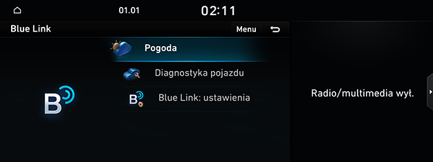 - [Blue Link: ustawienia]: Umożliwia sprawdzenie stanu usługi i danych modemu.