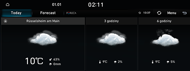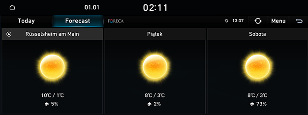 Na ekranie można wyświetlić bieżące informacje o pogodzie na dzień dzisiejszy/1 dzień później/2 dni później.