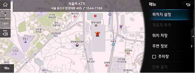 - [위치 저장]: 현재 선택한 위치를 등록 위치에 저장합니다. 등록된 위치를 확인하려면 [메뉴] > [목적지 검색] > [등록 위치]를 누르세요.