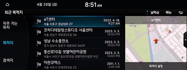 - [목적지]: 최근에 목적지로 설정된 위치를 표시합니다.