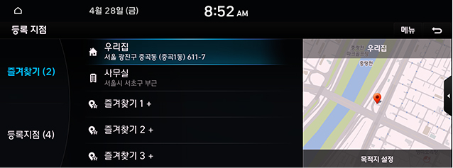 - 지도 화면에서 [메뉴] > [목적지 검색] > [등록 지점]을 누르세요.