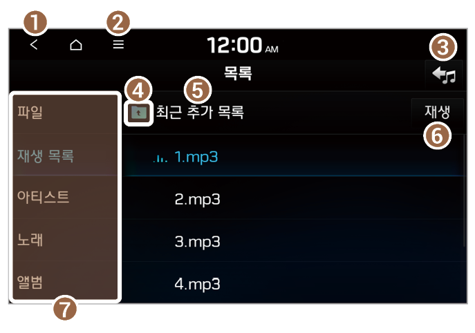 최근 추가된 곡을 재생하려면, 재생 목록 > 최근 추가 목록을 눌러 음악 파일을 재생하세요.