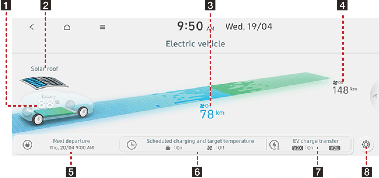 Depending on current capacity of the battery, the following information is displayed: driving range when the climate is turned on and off, total battery power remaining, and expected charging times by charging type and charging limit.