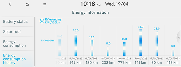 Press EV > Energy information > Energy consumption history. Or press EV > [