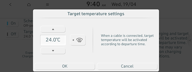Press EV > Scheduled charging and target temperature > Target temperature.
