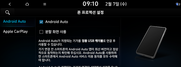 Android Auto/Apple CarPlay: 폰 프로젝션을 활성화합니다. 이 시스템을 통해 폰 프로젝션을 제어할 수 있습니다.