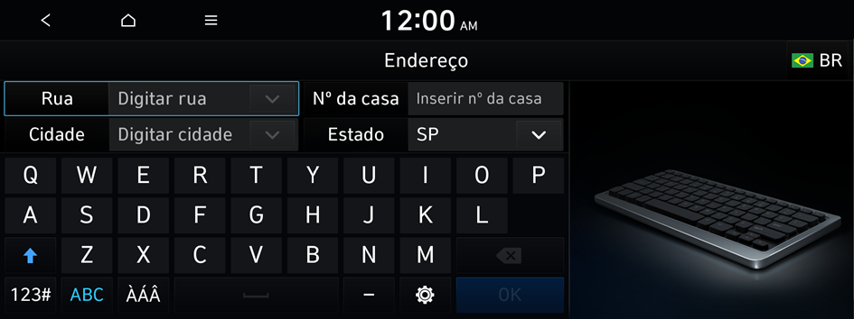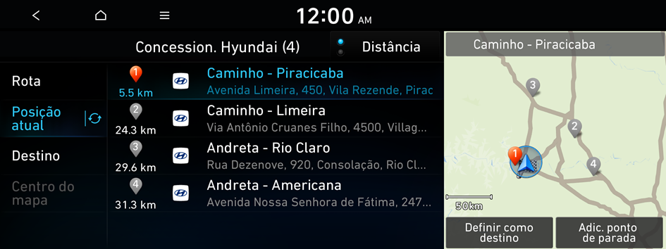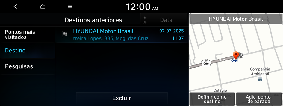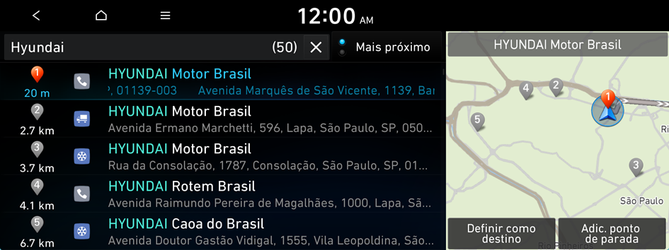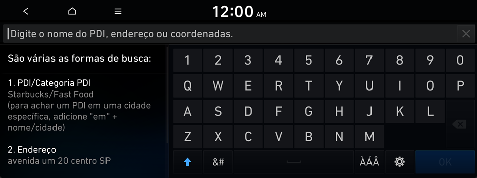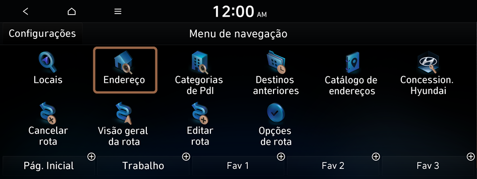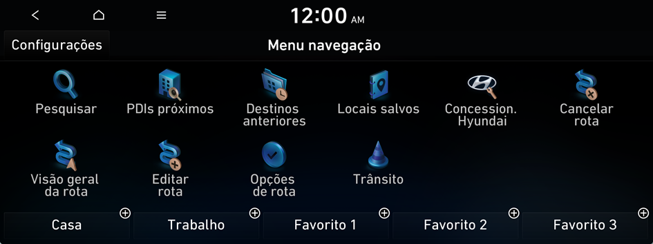 No menu navegação, você pode definir o destino usando várias pesquisas, como inserir informações de localização ou selecionar destinos recentes ou lugares categorizados.