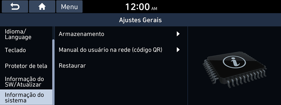 Você pode verificar o espaço de armazenamento do sistema. Você também pode usar seu smartphone para acessar o manual on-line do usuário do sistema ou restaurar todas as configurações do sistema para os valores padrão.
