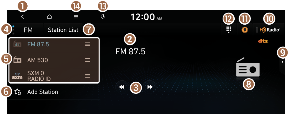 The radio screen provides various functions while listening to radio broadcasts.