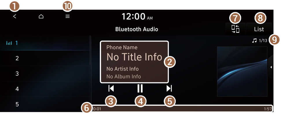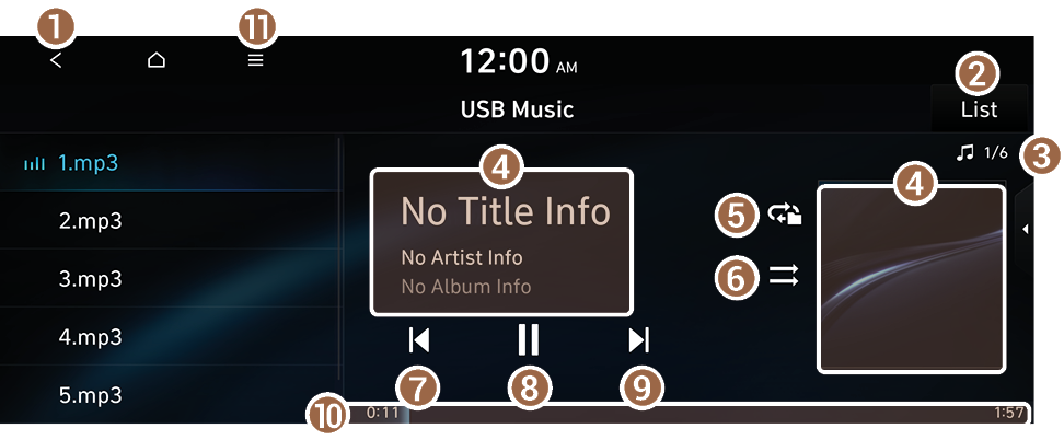4. Displays the information of the current music. Press the artist or album info of the current song to go to list of songs by the artist or from the album.