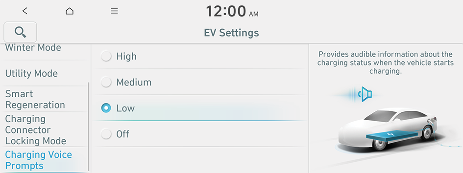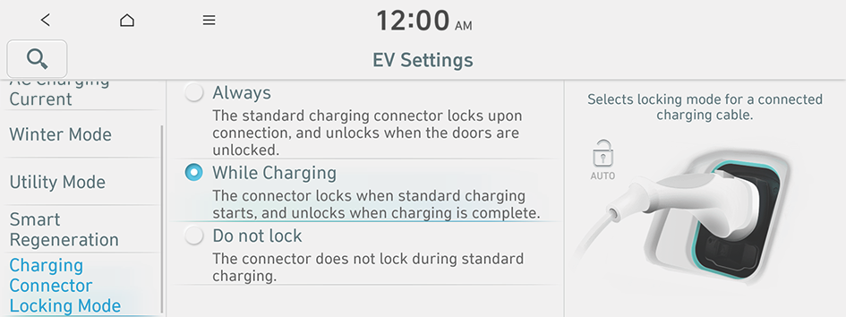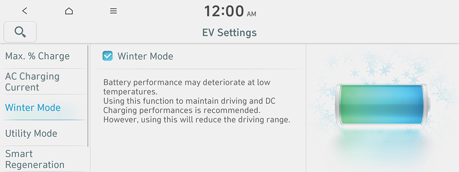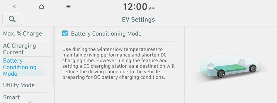 Use during the winter (low temperatures) to maintain driving performance and shorten DC charging time. However, using the feature and setting a DC charging station as a destination will reduce the driving range due to the vehicle preparing for DC battery charging conditions.