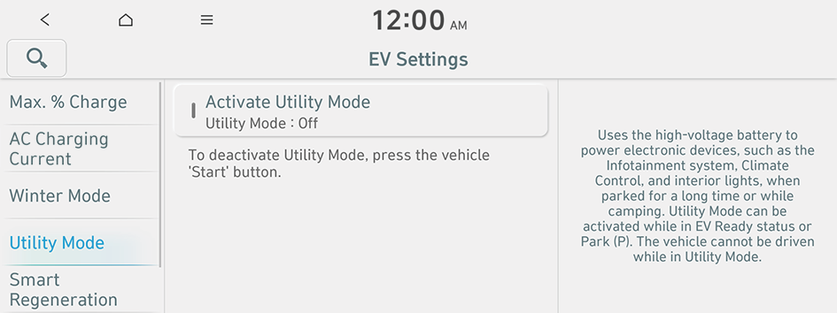 Turns on utility mode. When this function is on, electric systems on the vehicle are operated using the driving (high-voltage) battery.