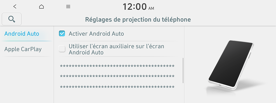 Il est recommandé d’utiliser un câble USB approuvé fourni par le fabricant de votre téléphone intelligent. L’utilisation d’un câble USB non approuvé peut causer une erreur de projection du téléphone ou un problème de fonctionnement du système.