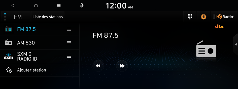 : les diffusions des radios sont automatiquement mises en mémoire tampon à chaque démarrage du véhicule. En conséquence, vous pouvez rechercher des radios pendant l'écoute (selon équipement).