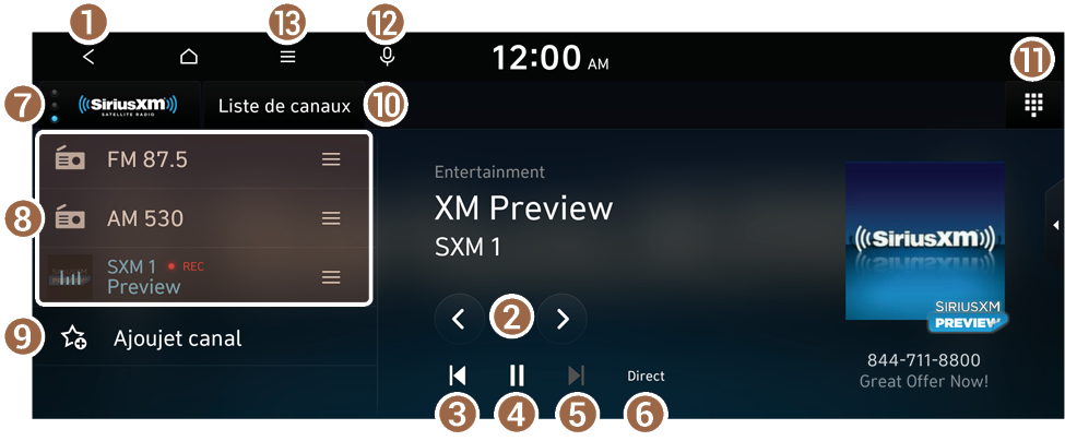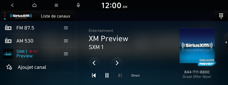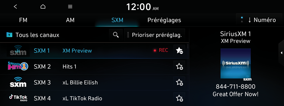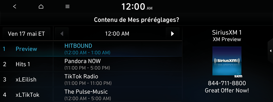 apparaît à côté des 10 premières radios SiriusXM enregistrées. Une fois que les radios préréglées sont enregistrées, leurs diffusions sont automatiquement mises en mémoire tampon pour votre confort à chaque démarrage du véhicule.Vous pouvez sélectionner une radio SiriusXM parmi celles disponibles.