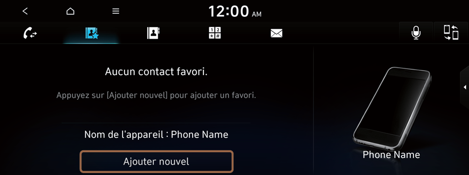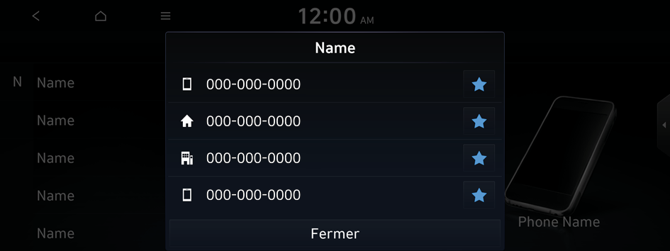 Lorsque vous connectez votre appareil mobile au système en Bluetooth, vos contacts enregistrés dans l'appareil sont téléchargés sur le système et vous pouvez ajouter des numéros de téléphone fréquemment utilisés à la liste des favoris. Appelez vos contacts favoris rapidement et facilement en les sélectionnant dans la liste.