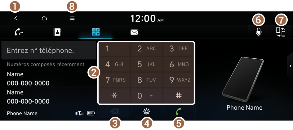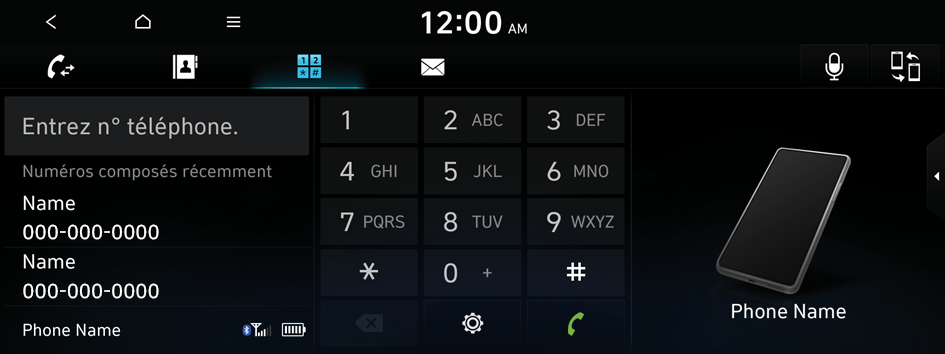 Lorsque vous connectez votre appareil mobile au système en Bluetooth, vous pouvez saisir et composer un numéro de téléphone depuis l'écran du système, sans interagir avec l'appareil. Votre véhicule intègre un microphone et un haut-parleur qui vous permettent d'utiliser un téléphone cellulaire facilement et en toute sécurité.