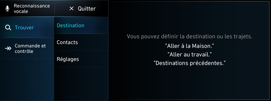 Commandes de navigation | Lancez la navigation et définissez une destination ou des étapes. | Chercher <PI> Maison/Aller au travail Recalculer trajet |