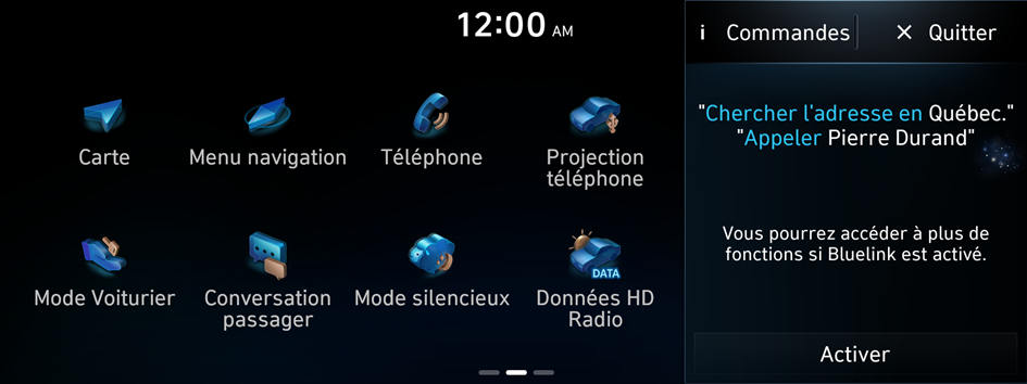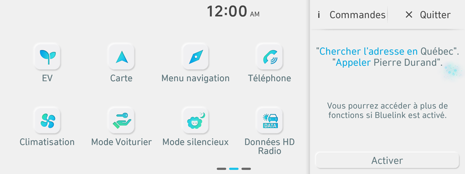 Les commandes de contrôle du véhicule | Contrôlez la climatisation, le chauffage ou d'autres fonctions du véhicule. | Activer/Éteindre le chauffage Activer/Désactiver air conditionné Active/Désactive siège chauffant. Activer/Désactiver la ventilation du siège |
