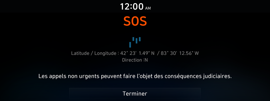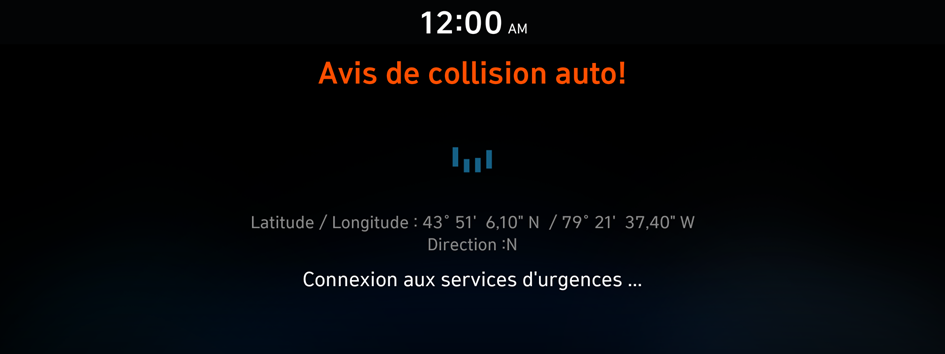 Le service fournit immédiatement de l'aide lors d'un accident qui entraîne le déploiement d'un coussin de sécurité gonflable. Lorsque cela se produit, un avis de collision auto (ACN) contenant les informations du client et de localisation est automatiquement transmis au centre Bluelink.