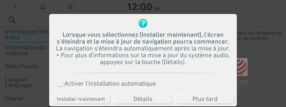 Une fenêtre de notification apparaît lorsque votre véhicule est éteint. La fenêtre de notification vous permet de mettre à jour la carte de navigation et le système d'infodivertissement.