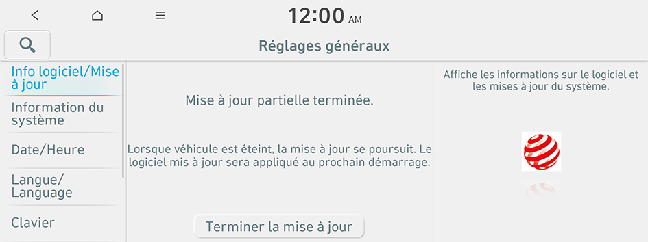 Vous avez accès au logiciel et à la carte les plus récents au moyen de la mise à jour sans fil. La dernière version du logiciel est automatiquement téléchargée lorsque le véhicule est démarré. Une fois l'installation du logiciel terminée, vous pouvez afficher les renseignements sur la mise à jour dans la fenêtre de notification.