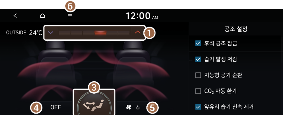 - • 후석 열선/통풍: 후석 열선/통풍 설정 화면으로 이동합니다.(사양 적용 시)