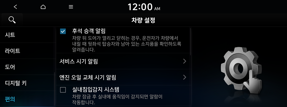 환경 차량에서 사용할 수 있는 편의 기능을 설정할 수 있습니다.