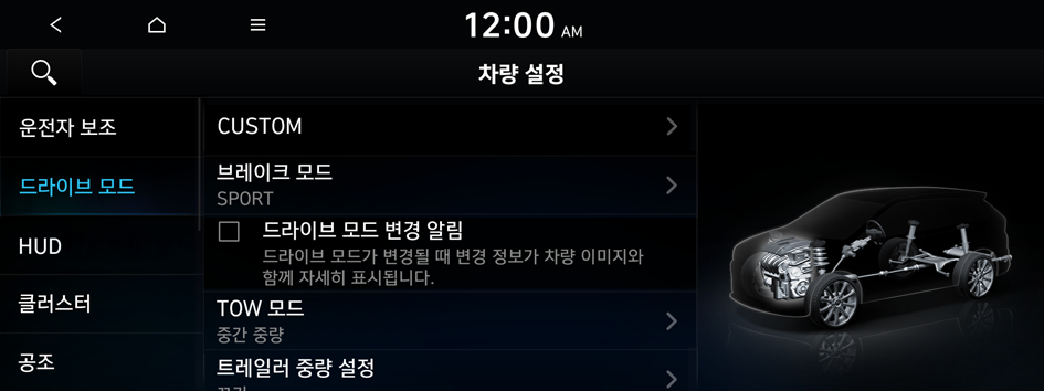 드라이브 모드가 변경될 때 차량 이미지와 함께 표시되도록 설정할 수 있습니다.