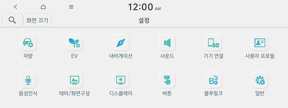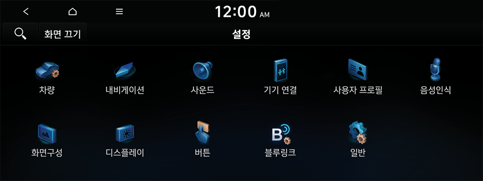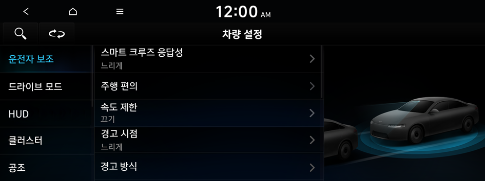 을 누른 후 검색어를 입력해 설정 항목을 검색할 수 있습니다.안전 운전을 위해 운전자를 보조해 주는 다양한 시스템을 설정할 수 있습니다.