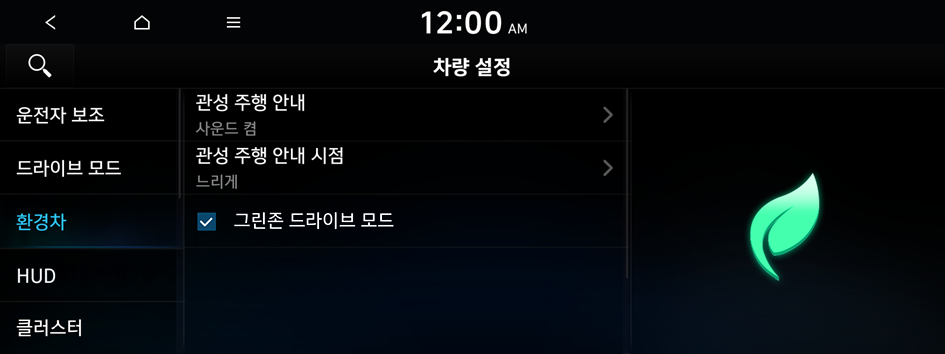 차량의 주행이나 내외부 환경과 관련된 기능을 설정할 수 있습니다.