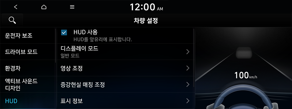 차량 주행 시 주행 속도나 도로 정보 등을 표시해주는 헤드업 디스플레이 기능을 설정할 수 있습니다.