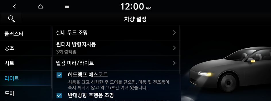 차량의 조명 사용 환경을 설정할 수 있습니다.