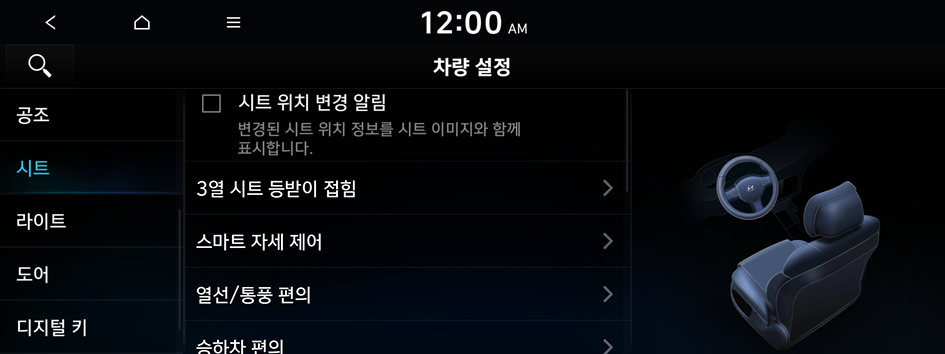 운전석과 후석 시트, 스티어링 휠의 움직임이나 열선을 제어하는 등 시트 및 스티어링 휠에 관련된 다양한 기능을 설정할 수 있습니다.