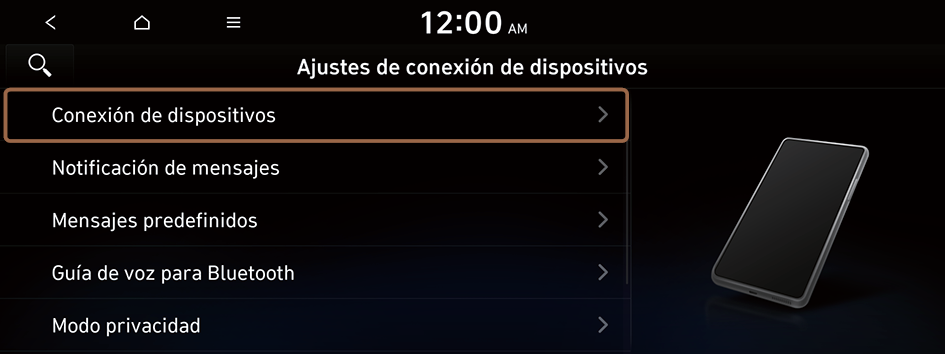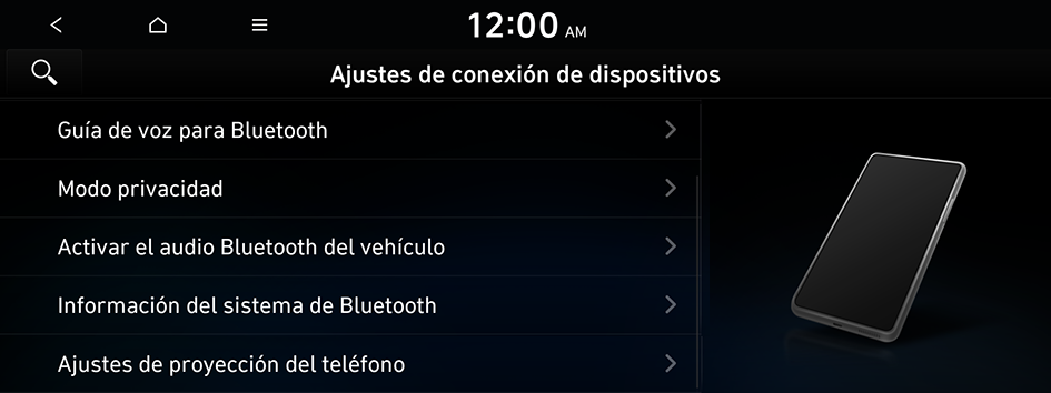 Puede administrar los dispositivos Bluetooth o configurar sus ajustes de funcionamiento. También puede activar la proyección del teléfono para poder controlar las aplicaciones del teléfono inteligente desde la pantalla del sistema después de conectar el teléfono inteligente al sistema.