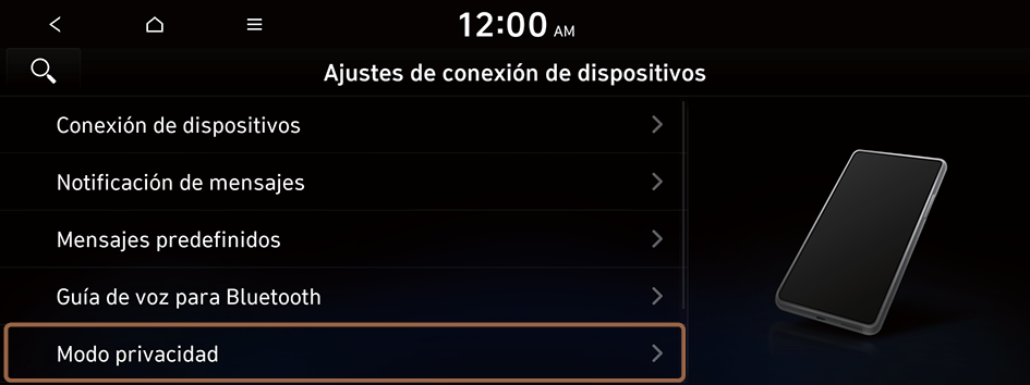 Active o desactive el modo de privacidad. Permite ocultar datos, incluidos los contactos y el historial de llamadas para que no aparezcan en la pantalla del sistema para proteger la privacidad.