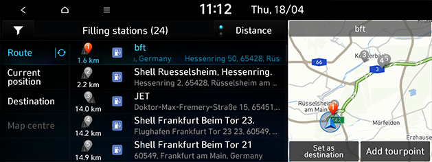 Route: Uneko ibilbidean zehar dauden Hyundai zerbitzuak bilatzen ditu. Helmuga ezarrita dagoenean soilik dago eskuragarri.