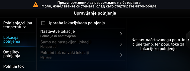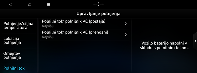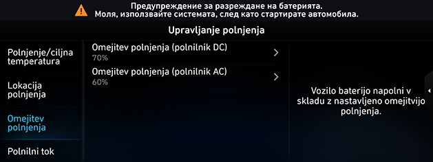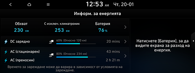 В зависимост от текущия капацитет на батерията се визуализира следната информация: диапазон на шофиране при включен и изключен климатик, общ оставащ заряд на батерията и очаквани времена на зареждане според типа на зареждане и границата на зареждане.