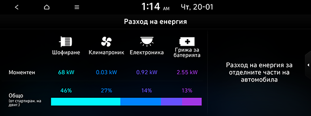 Визуализират се текущата консумация на енергия за Шофиране, Климатик, Електроника и части за грижа за акумулатора.