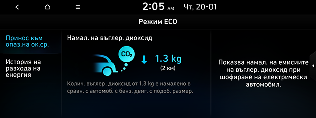 Визуализира се информация за екологичния принос (Разстояние за шофиране и намаляване на въглеродния диоксид) чрез Еко шофиране.