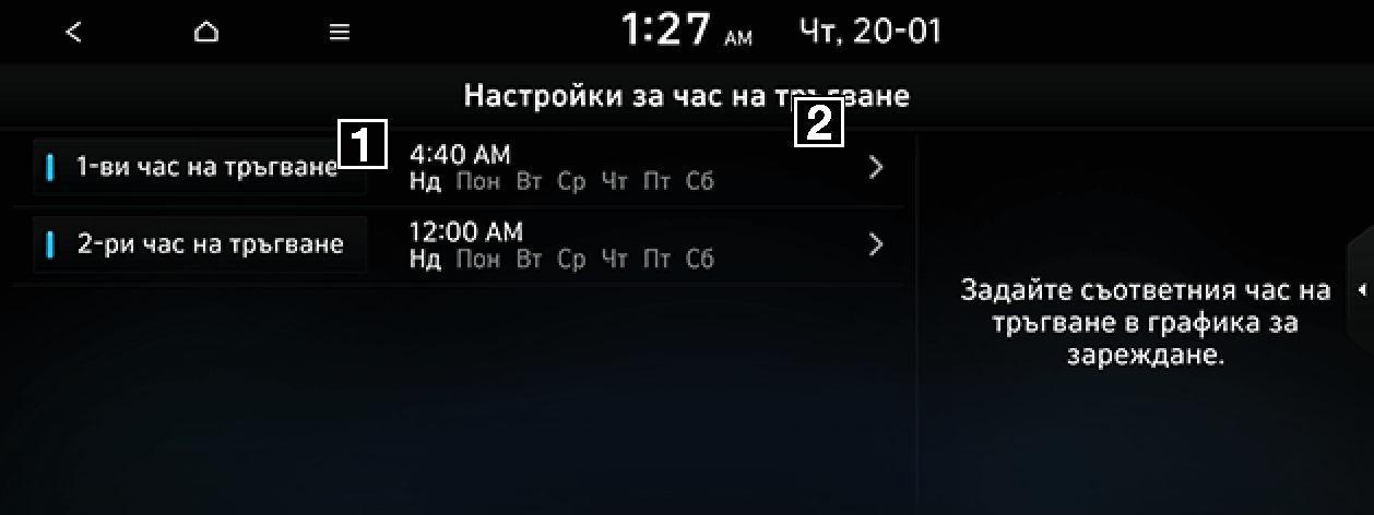 Тази функция позволява автоматично започване на зареждането и регулира вътрешната температура чрез автоматично включване на управлението на климатичната система в автомобила в определеното време в деня, което сте избрали.