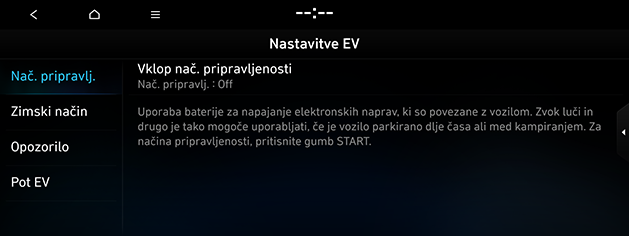 Натиснете EV > Настройки на електромобила > Реж. на готовн..