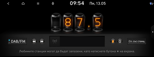 2. Натиснете AM, за да смените обхвата на DAB(ако е налично)/FM, ако радиочестотния диапазон е зададен на AM. Показва се последната станция, която сте слушали.